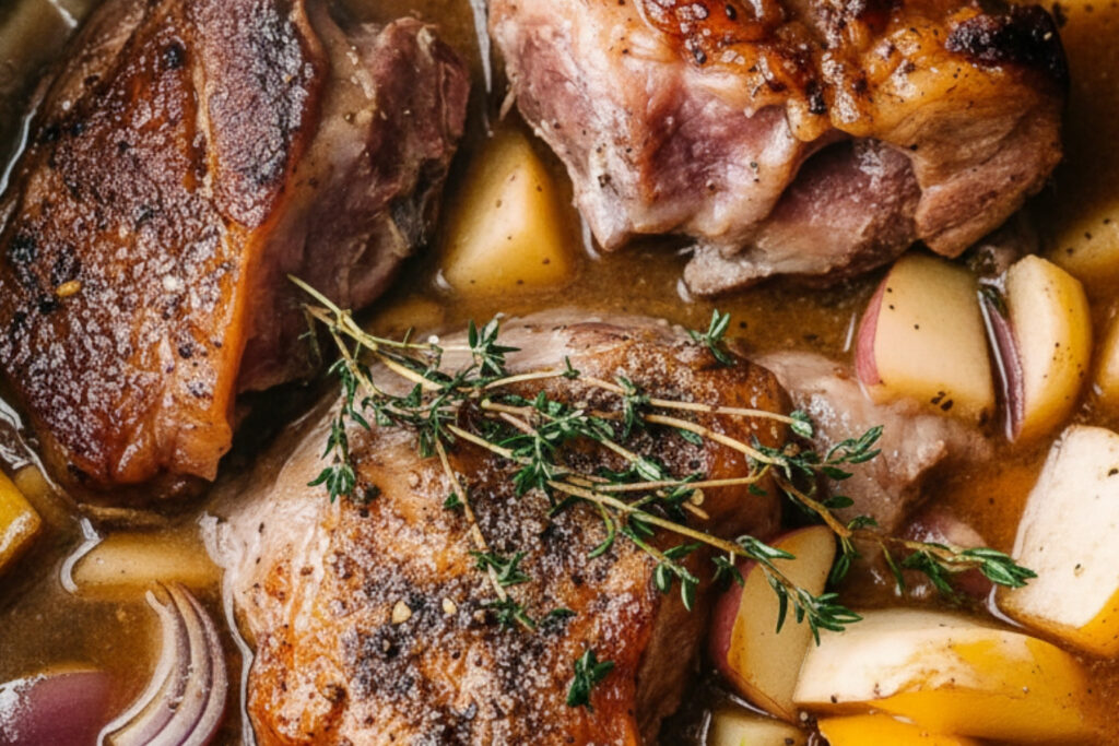 This comforting and flavorful pork shoulder is slowly braised in a savory apple cider sauce with herbs, garlic, apples, and onions until fall-apart tender.