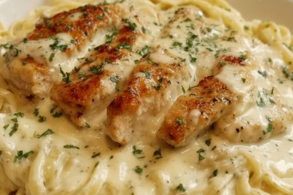 - Step 5: Finally, add your cooked pasta right into the skillet. Toss it all together so every noodle gets coated. Top it with those beautiful slices of chicken. A sprinkle of fresh parsley makes it look so pretty. Then it’s ready to serve to your hungry family.