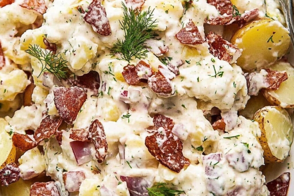 This unique potato salad features crispy smashed potatoes tossed in a creamy dressing with bacon, hard-boiled eggs, and red onion for a delicious twist on a classic.