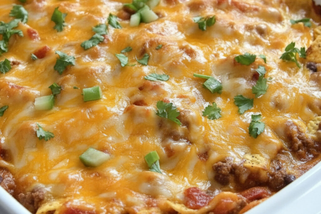 A hearty and flavorful layered casserole with seasoned ground beef, beans, tomatoes, and cheese, all baked over a base of crunchy tortilla chips.