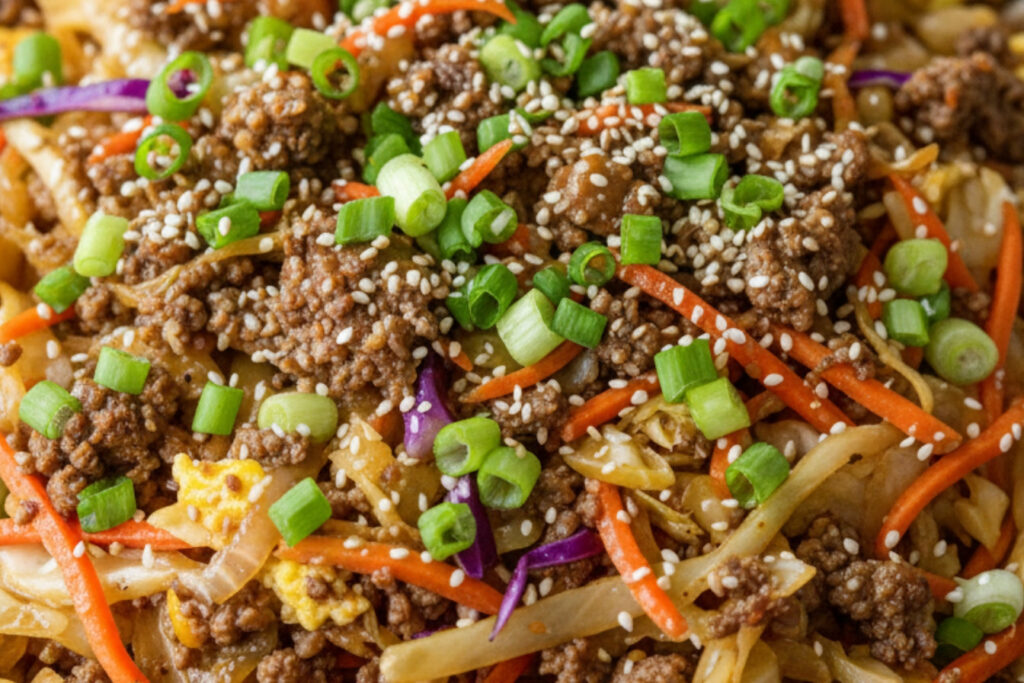 A quick and easy deconstructed egg roll with seasoned ground meat and coleslaw mix, all cooked in one skillet for a flavorful, low-carb meal.