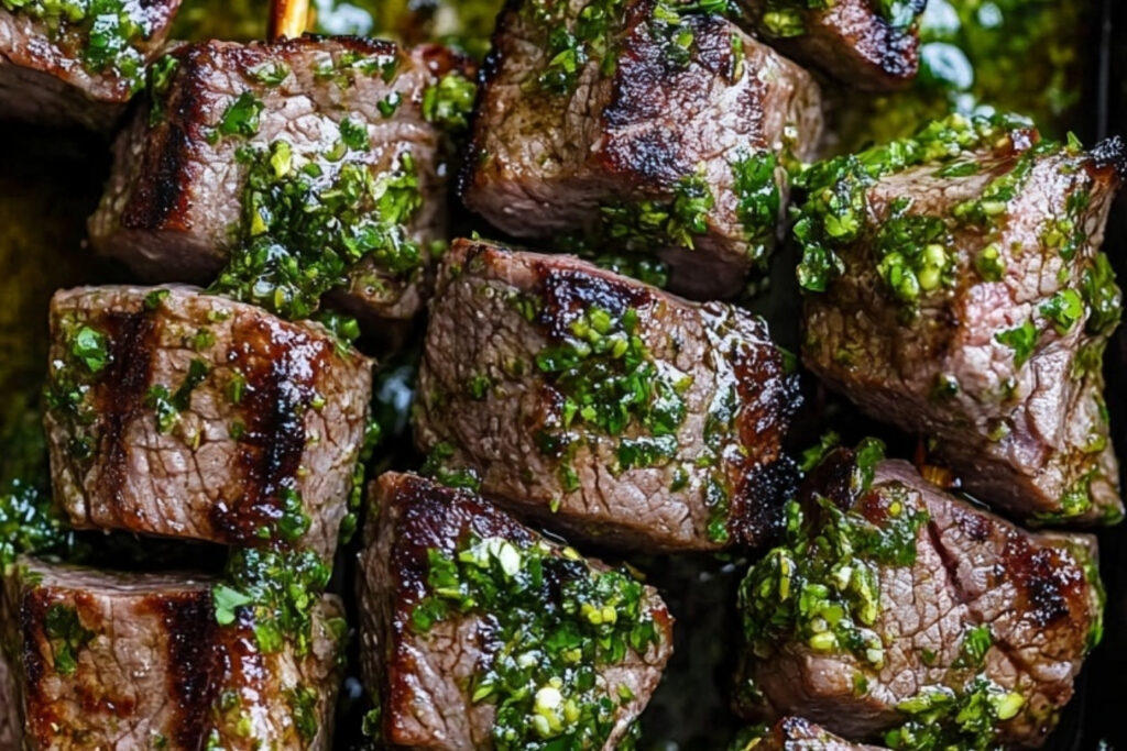 Juicy grilled steak skewers served with a vibrant and herbaceous chimichurri sauce, perfect for a quick and flavorful meal.