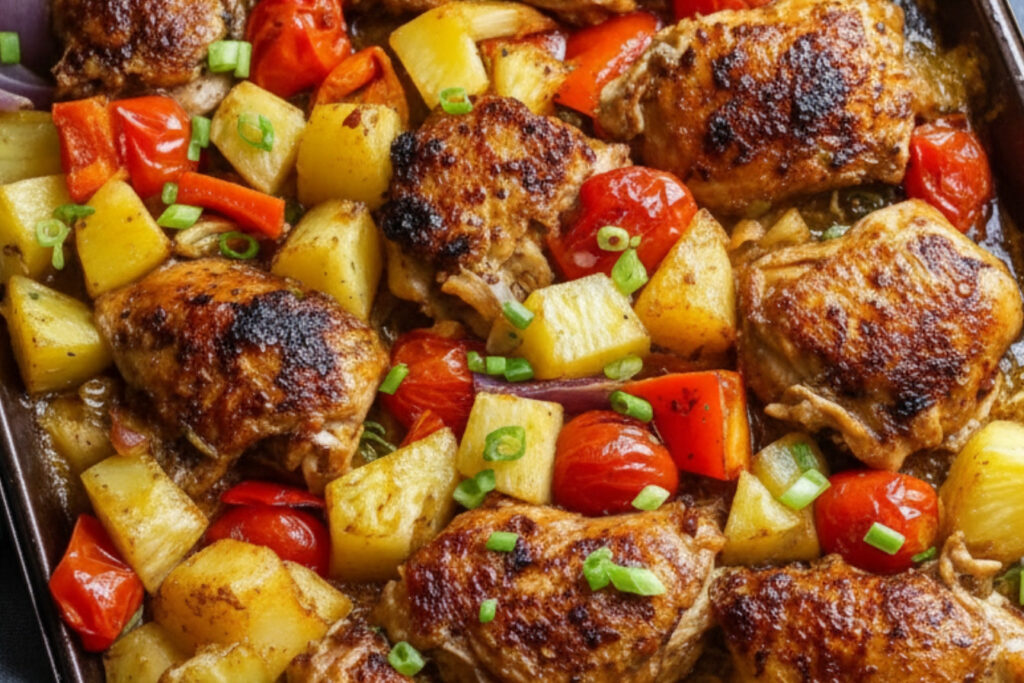 A simple and flavorful one-pan meal featuring marinated chicken, sweet pineapple, and fresh vegetables, roasted to perfection.