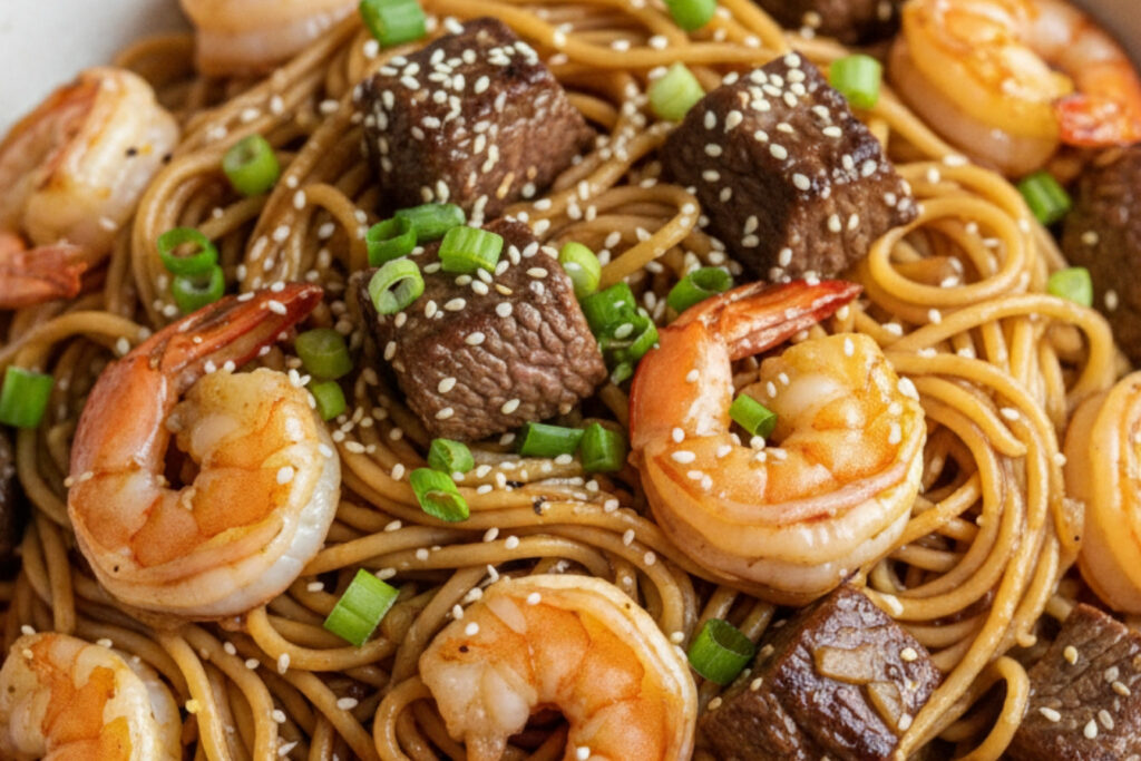 This dish is a full meal in one pan. It has protein from the steak and shrimp. The noodles give you energy. This matters because a good meal fuels your body and your day.
