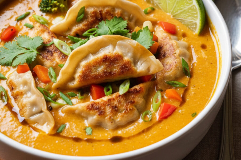A creamy, comforting soup featuring tender dumplings in a fragrant Thai coconut curry broth.
